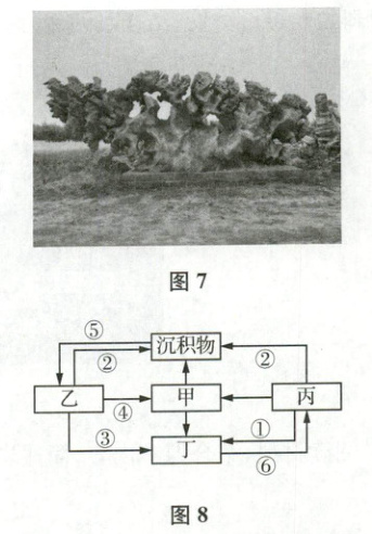 (2025 扬州期中)灵璧石产于安徽省灵璧县,该地在震旦纪期间为一片浅海海滨,在海相沉积作用下发育成各类岩石矿体。进入古生代,发生火山喷发活动,原有岩石在高温作用下形成灵璧石。图7为“灵璧石景观图”,图8为“岩石圈物质循环示意图”。据此完成4~