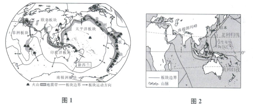材料二 图1为“六大板块示意及全球火山地震带分布图”,图2为“世界局部地区板块示意图”。