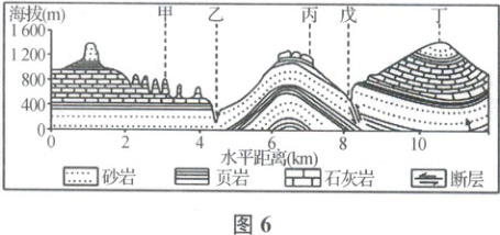 5. 如果图6所示地区修一条与剖面垂直的地下隧道,应选择甲、乙、丙、丁四地中的