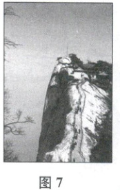 材料三 某游客游览华山后在日记中写道:“‘千尺幢,百尺峡,老君犁沟往上爬。’在华山北峰往南看,只见山峰耸立,与天上的白云相接,不知是天盖住了山,还是山耸入了天。由北峰下来后,一路南上,十多分钟的路程,我们来到了一条长几百米,宽不足1m的山脊,这便是华山著名险道之一——苍龙岭(以其苍黑色的外部和其似悬龙般的地势而得名)(见图7)。这里两边都是千丈绝壁,仅有这条石脊通达对岸,行走其间让人心惊肉跳。”