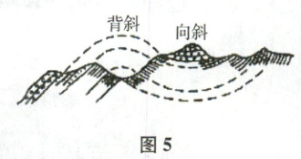 3. 在野外,经常能看到地形与褶皱构造不相吻合的现象,称为地形倒置。结合图5,判断其形成的地貌,分析其成因。