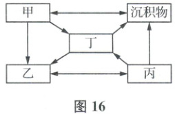6.A 该地岩石有明显的层理构造,故为沉积岩,根据图16并结合所学知识,可以判断出沉积物直接指向的应该为沉积岩,故甲为沉积岩,A正确;乙箭头三进一出,为岩浆,丙是由乙岩浆转化而来,则丙为岩浆岩,丁即为变质岩,B、C、D错误。故选A。