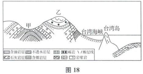 (1)由图可知,乙处岩层向下弯曲,为向斜构造。甲处岩层向上拱起,为背斜构造;地貌上两侧高中间低,为山谷地形,故该构造地貌类型为背斜谷。背斜在内力作用下向上拱起形成山岭,但由于背斜顶部受张力,岩层破碎,易被外力侵蚀成谷地。台湾岛位于亚欧大陆东部,季风气候显著,故该外力作用主要为流水侵蚀作用。