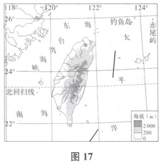 台湾岛——中国第一大岛,台湾山脉呈东北—西南走向纵贯台湾岛的东部,岛上风景秀丽,生物资源丰富。图17为“台湾岛简图”,图18示意我国东南沿海沿北回归线的地质剖面。