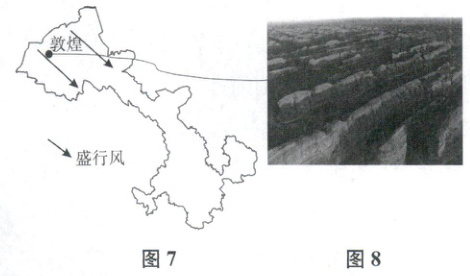 (2025 南通如皋中学阶段练习)在盛行风的作用下,干旱地区地面常形成很多不规则的土墩(垄)和浅沟(槽),称为雅丹地貌。图 7 示意敦煌位置,图 8 为“雅丹地貌景观图”。据此完成 1~3 题。