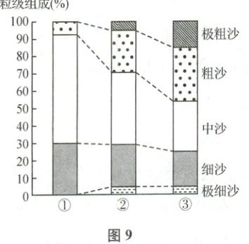 (2024 常州高级中学期中)巴里坤鸣沙山位于新疆巴里坤盆地东缘。研究表明,末次冰期后的全新世初期,全球增温,很多松散碎屑物被带入巴里坤盆地中西部,为巴里坤鸣沙山的形成提供了大量物源。图 9 示意目前巴里坤鸣沙山西北坡不同位置表层沉积物样品的粒级组成。沙山表层沉积物总体以中沙为主,分选性较好。据此完成 4~6 题。