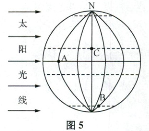 (填“晨线”或“昏线”)。(2)图中A、B、C三地比较,自转角速度的大小关系是