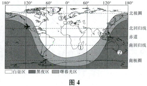 (2025镇江期中)一年中总有某时刻世界上99%的人口都“沐浴在阳光之下”,其中83%的人处于白昼,16%的人处于曙暮光(太阳位于地平线以下0~18°)中。图4为“该时刻全球日照示意图”。据此完成9~10题。