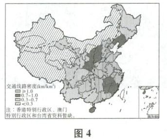 图4为“我国交通线路密度分布图”,图5为“某地区交通线路图”。
