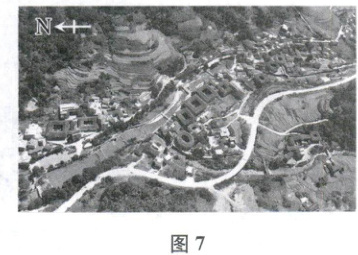 (2024连云港模拟)客家土楼多分布在山地丘陵的山间谷地,呈串珠状分布于溪河两岸。土楼多以夯土为墙体,以大块卵石筑基,墙基高者2m有余。图7为“我国南方某地客家土楼分布航拍图”。据此完成1~3题。