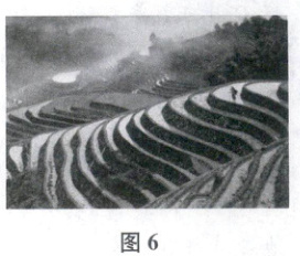 材料二 梯田是在丘陵山坡地上沿等高线方向修筑的条状阶台式或波浪式断面的田地,是治理坡耕地水土流失的有效措施,蓄水、保土、增产作用十分显著。我国有梯田面积8亿亩左右,主要分布在南方地区。图6为“梯田景观图”。