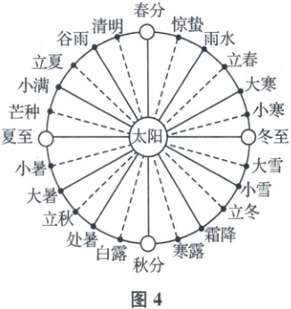 (2025扬州期中)图3示意某日地球晨昏线(虚线为昏线)分布,其中P地为昏线与80°N纬线圈的切点,甲地为昏线与60°N纬线圈的交点,此日过后太阳直射点向北移动。图4为“二十四节气与地球在公转轨道上的位置关系示意图”。据此完成5~7题。