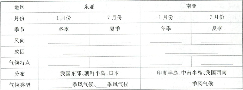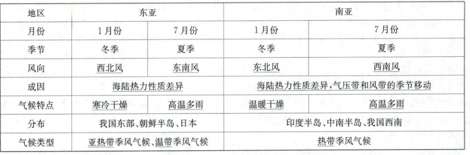 2.绘图略。南亚夏季风成因:南半球的东南信风随太阳直射点北移,越过赤道右偏,形成西南季风。澳大利亚西北部夏季风成因:北半球的东北信风随太阳直射点南移,越过赤道左偏,形成西北季风。