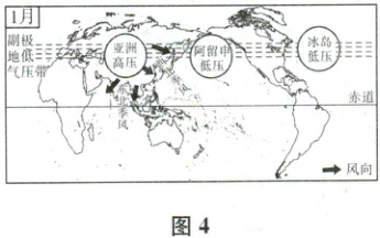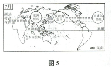 图4和图5分别为“1月、7月北半球主要气压中心和东亚、南亚风向分布示意图”。