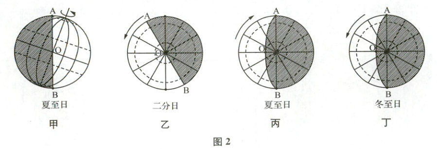 3. 图 2 为“二分二至日太阳光照图”。判断图 2 中的晨线和昏线,并总结判断晨线与昏线的基本方法。