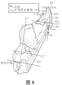 马达加斯加全岛几乎均位于热带区域,在气候上受风系与海拔高度的影响大。东南沿海属热带雨林气候,终年湿热,季节变化不明显,年平均气温24℃,年降水量2000~3000mm,生长着茂密的热带植物和森林。中部为热带高原气候,温和凉爽,土地肥沃。西部则为季节降水变率很大的气候区,西南部是全岛最炎热的半荒漠地区,年平均气温26.6℃。图8为“该岛降水分布图”。