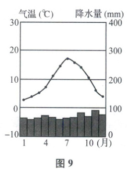 温带海洋性气候是一种全年温和湿润的气候类型,其特征十分明显:冬无严寒,夏无酷暑,全年降水分配较为均匀。这类气候全年在盛行西风影响下,西岸常有暖流影响,增温增湿,西风从暖洋面吹来,降水颇多;冬季常有温带锋面气旋来袭,因而尽管全年有雨,但秋冬降雨量通常略多于春夏。图9为“伦敦气候资料图”。