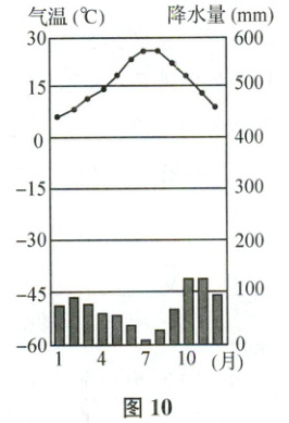 地中海气候又称副热带夏干气候,冬季气候温和,最冷月气温在4~10℃之间。夏季温度在沿海和内陆有较大区别,沿海受冷洋流影响,温度较低,最热月在22℃以下,称为凉夏型。在内陆距海较远地区,海洋调节较小,空气干燥,暖热,最热月温度在22℃以上,称为暖夏型。全年降水量300~1000mm,冬季半年约占60%~70%,夏季半年只有30%~40%,冬季降水量多于夏季。图10为“意大利罗马气候资料图”。