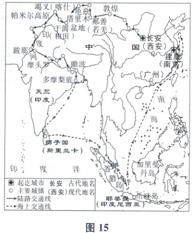 (2025常州期中)公元399—412年,僧人法显西行求法,游历三十余国,其旅行见闻《佛国记》是现存最早关于中国与南亚陆海交通的地理文献。图15为“法显求法路线示意图”。据此完成1~3题。
