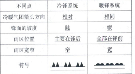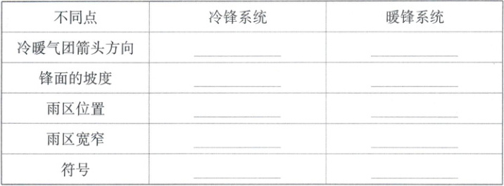 3. 观察材料二“冷锋系统示意图”和“暖锋系统示意图”,思考冷锋系统和暖锋系统的不同点,并填写下表。