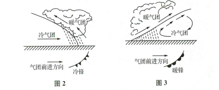 材料二 由冷气团主动向暖气团移动的锋为冷锋,由暖气团主动向冷气团移动的锋为暖锋。图2为“冷锋系统示意图”,图3为“暖锋系统示意图”。