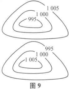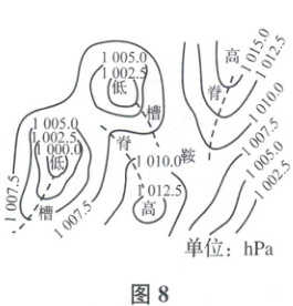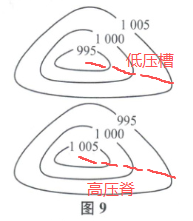 1. 认识图8中的高压脊和低压槽,并画出图9中脊线和槽线。