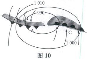 2. 判断图10(单位:hPa)锋面气旋中A、B、C、D四地最有可能出现阴雨天气的地点。