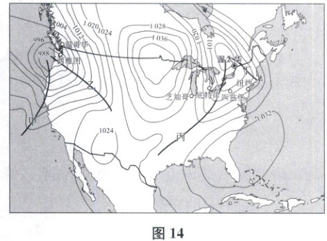 (2025南通期中)图14为“北美洲某月某时刻海平面等压线分布图(单位:hPa)”,甲、乙、丙、丁为锋面。读图完成6~8题。