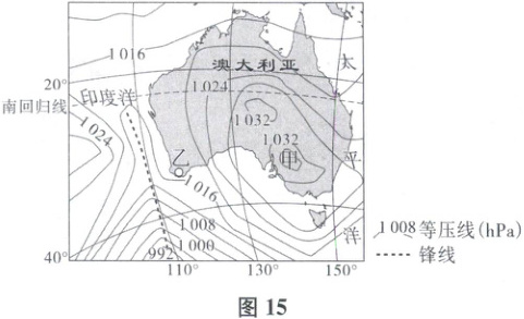 (2025南通海安高级中学月考)澳大利亚大气活动中心的势力、位置、性质有明显的季节变化。图15为“某日澳大利亚及其周边海域海平面等压线分布图”。据此完成9~10题。