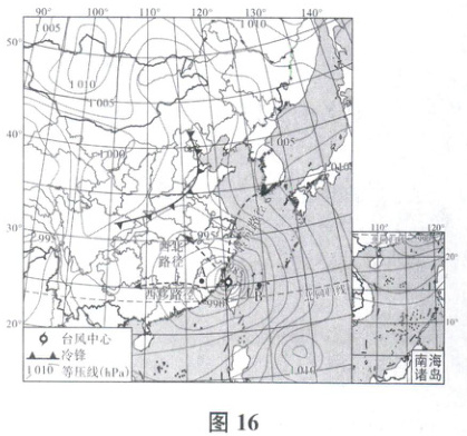 图16为“某年夏季T时刻亚洲部分地区的海平面气压分布图”。
