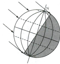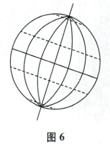 (2)在图6中绘制6月22日的太阳直射光线、晨昏线,并用阴影表示夜半球(太阳光线在下图左侧)。