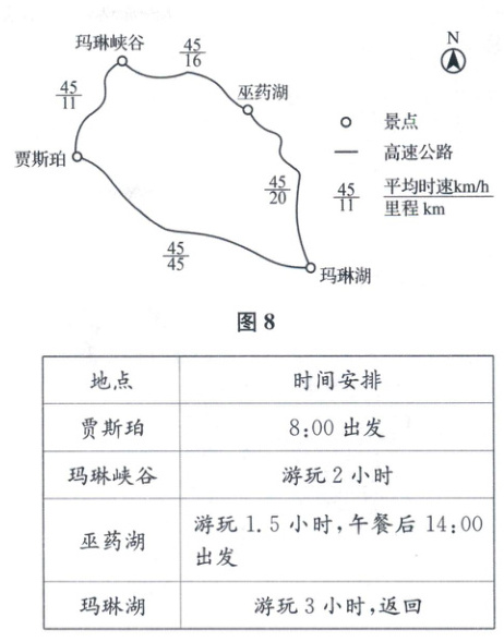 (4)第二天早餐后,一家人开始了一天的旅行(注:图8和下表表示意当天的旅行线路和时间安排)。出发时小明想为长辈选择能避免阳光直接照射的座位,应该选择