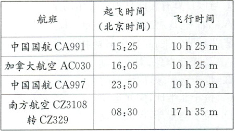 (1)地接旅行社将在当地时间(夏令时)20:00左右到温哥华国际机场接机,从节约时间角度考虑,旅行社应当为大家购买上表航班中的