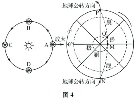 (1)在图4相应线段上补画箭头,正确表示地球的自转方向。