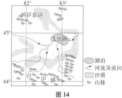 (2025徐州期中)艾比湖为我国新疆第一大咸水湖,属于封闭内陆湖泊。长期以来,不合理用水导致该湖萎缩,引发环境问题。近年来,当地加强流域用水统一管理,湖泊面积逐步扩大。图14为“艾比湖位置示意图”。据此完成6~8题。