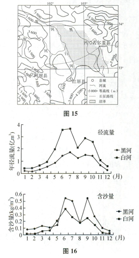 材料二 图15为“红原县及周边位置图”,图16为“黑河、白河多年平均径流量和平均含沙量变化示意图”。