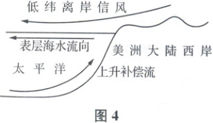 4. 除了盛行风、密度差异影响洋流流向外,还有一种是因为海水流走以后,附近或底层的海水来补充的情况(如图4所示)。根据图示原理,分析南美洲西海岸洋流的形成原因。
