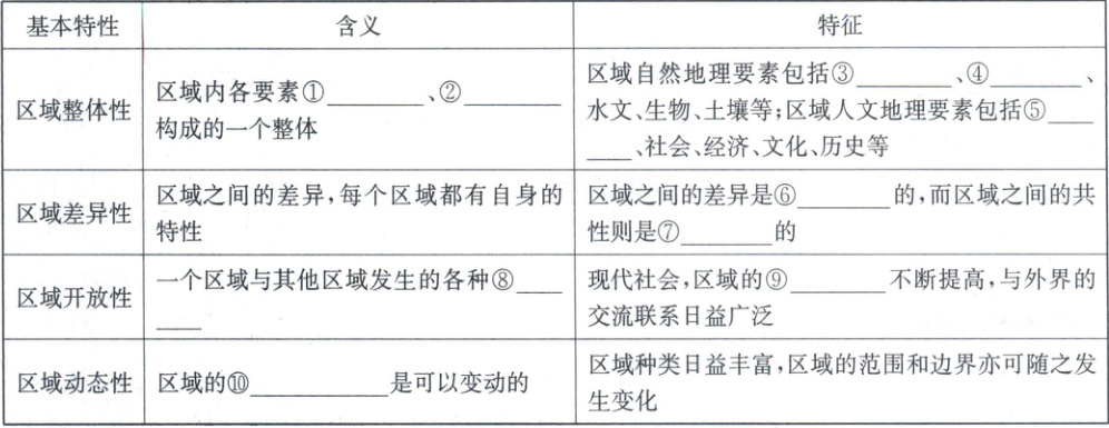(6)①相互作用 ②相互影响 ③地质地貌 ④气候 ⑤人口 ⑥绝对 ⑦相对 ⑧联系 ⑨开放性 ⑩类型和范围