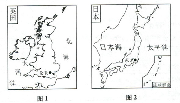 材料一 日本和英国分别位于亚欧大陆的东西两侧。图1、图2分别为“英国地理位置图”和“日本地理位置图”(如下列图片所示)。