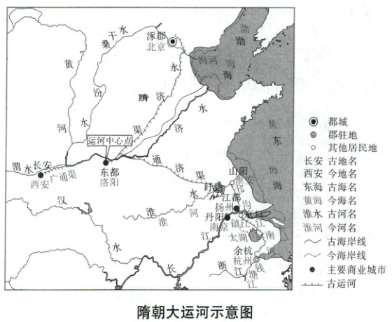 材料一 隋朝大运河以洛阳为中心,南至余杭(今杭州市北部),北到涿郡(今北京市以南),全长 2700 多千米,沟通了海河、黄河、淮河、长江、钱塘江五大水系,是古代世界最长的运河(如下图所示)。