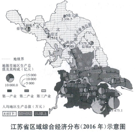 材料二 江苏省地处我国东部沿海,有长江、淮河流经,京杭大运河纵贯其境。历史源远流长,经济文化繁荣,教育科技发达,2016 年南京市和省内 12 个地级市皆进入了全国百强城市行列。但总体来看,苏南发展水平较高,苏中发展水平居中,苏北发展水平较低。江苏省明确提出,加强苏南对苏中和苏北的带动,尤其是加大对苏北地区的发展投入。这些年来,江苏省修建了多条铁路和公路,尤其是徐(州)宿(迁)淮(安)盐(城)高铁、连(云港)淮(安)扬(州)镇(江)高铁的修建,大幅度增强了苏南、苏中和苏北的发展联系,显著促进了江苏省经济社会的相对均衡发展。
