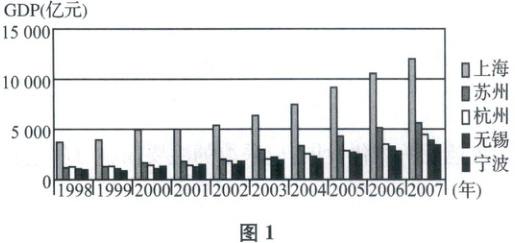 材料一 国内生产总值(GDP)是衡量一个国家、城市和地区生产力水平和综合经济实力的重要指标。中心城市的经济辐射力对周边城市在科技、就业、投资、产业迁移等各个方面的影响最终都会不同程度地体现在一个城市的GDP中。图1为“1998—2007年长江三角洲地区主要城市GDP变化图”(如下图所示),上海GDP每增长1个百分点能够带动苏州、杭州、无锡等城市GDP增长1个百分点以上。
