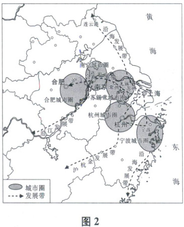 材料二 江苏制造业发展历史悠久,上海作为长三角的龙头,对苏南地区的经济发展产生了深刻的影响。20世纪70年代,随着上海大量技术工人(时称“星期日工程师”)节假日来到苏南,当地抓住机遇并走出了以乡镇企业发展制造业的新路径。近年来,以苏州为代表的苏南地区,与上海建立了愈发紧密的经济协作关系,“苏沪同城化”已成为苏州政府常提及的理念。目前,江苏小镇制造业十分发达,几乎每个镇都有自己的特色制造产业,但与发达国家相比,多数制造业仍依靠低成本进行发展。图2示意长三角地区经济发展带(如右图所示)。