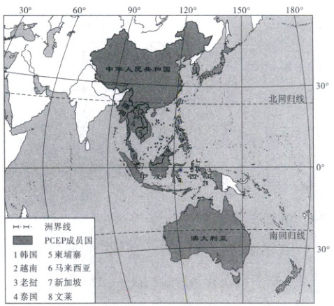 2025年1月1日,《区域全面经济伙伴关系协定》(RCEP)正式生效三周年。两年来,在RCEP政策红利推动下,中国与东盟产业合作不断深化,助力区域经济发展。2022年1月1日,RCEP正式生效实施,全球最大自贸区由此诞生,成员国包括东盟10国与中国、日本、韩国、澳大利亚、新西兰,覆盖世界约三分之一的人口和贸易量。RCEP生效后,关税减免、原产地累积规则等政策落地为中国与东盟经贸往来及产业链构建带来重大利好。右图示意RCEP成员国地理位置(如右图所示)。