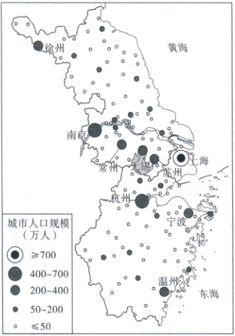 长江三角洲经济区包括上海市、江苏省和浙江省,总面积占全国的2.19%,GDP占全国的21.7%,城市人口比重达68%。经济区内部产业部门齐全,城市综合实力领先全国,区域协调度高。下图示意长江三角洲经济区城市分布(如下图所示)。据此完成1~2题。