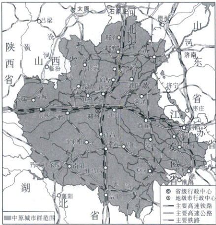 (2024连云港期中)近年来,以郑州市为中心的中原城市群正逐步形成。如图(见右栏上图)为“中原城市群分布示意图”。据此完成3~4题。
