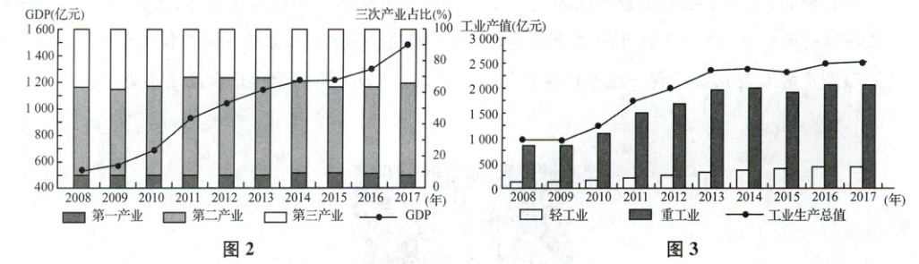材料二 黄石市2008年被定为资源枯竭转型试点城市,2015年年底关闭第一批露天矿山,采掘业产值明显下降。图2为“2008—2017年黄石市GDP和三次产业结构统计图”(如左下图),图3为“2008—2017年黄石市轻、重工业产值统计图”(如右下图)。