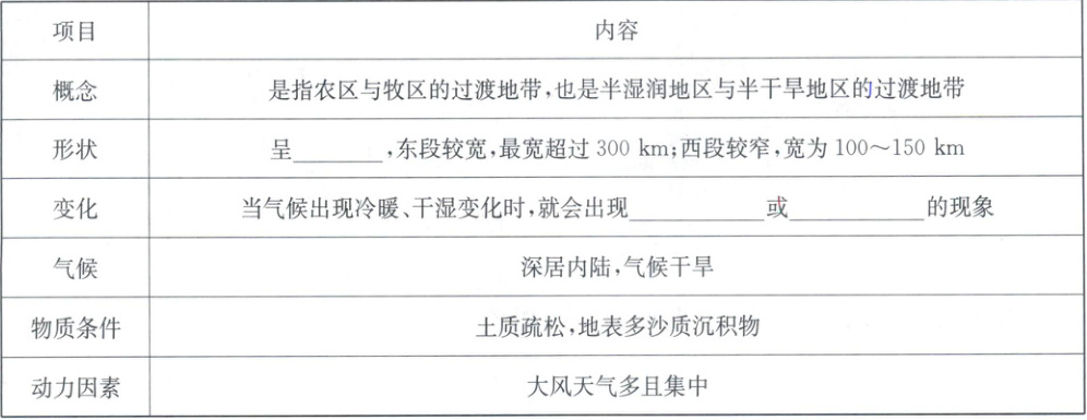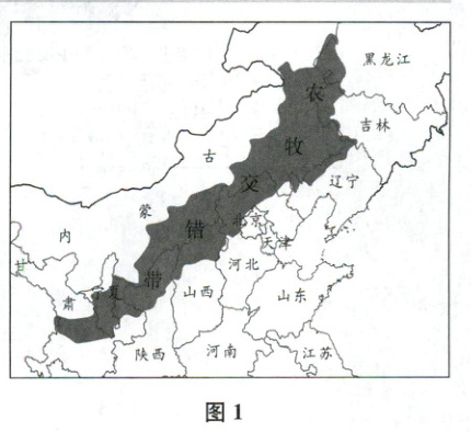 材料一 北方农牧交错带主要是指农区与牧区之间的过渡带,也是半湿润地区与半干旱地区的过渡地带。气候出现冷暖、干湿变化时,会出现农进牧退或牧进农退的现象。狭义的农牧交错带是指气候起决定性作用,年降水量在200~500 mm之间,且易受人类活动影响的生态脆弱地带。广义的农牧交错带指农业与畜牧业景观共存、镶嵌汇合的区域。图1为“我国北方农牧交错带图”(如右图所示)。