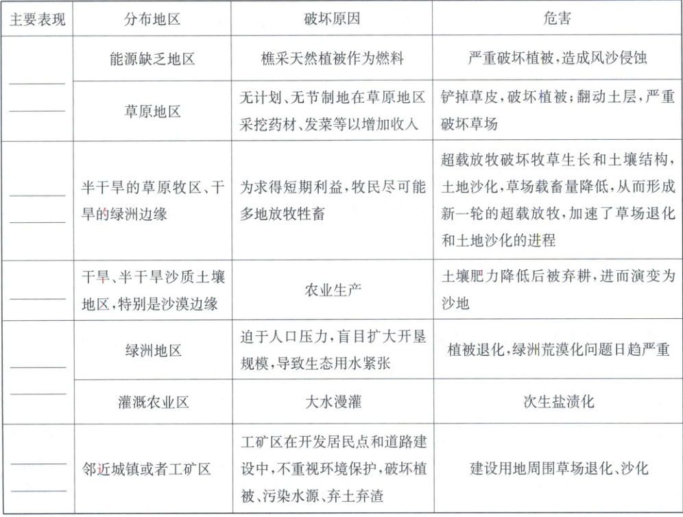 (2)过度樵采 过度放牧 过度开垦 水资源利用不当 工矿交通建设中不注意环保