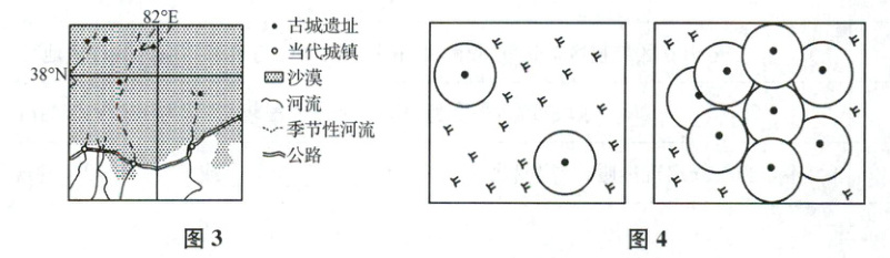 (4)根据材料三中的图3,分析当代城镇的位置与古城遗址相比发生了什么变化?原因是什么?